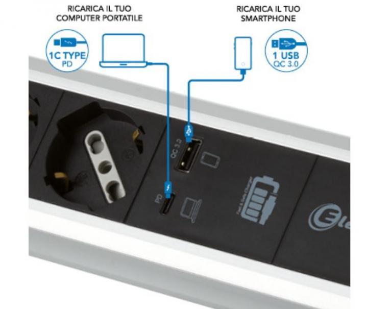 La prima multipresa sul mercato a raggiungere le potenze di ricarica richieste dai più moderni e potenti computer portatili di ultima generazione.Per una work station pulita ed efficiente, Electraline propone la nuova e pratica multipresa con caricatore di nuova generazione Power Delivery, capace di erogare fino a 60W per ricarica di computer e smarphone simultaneamente.