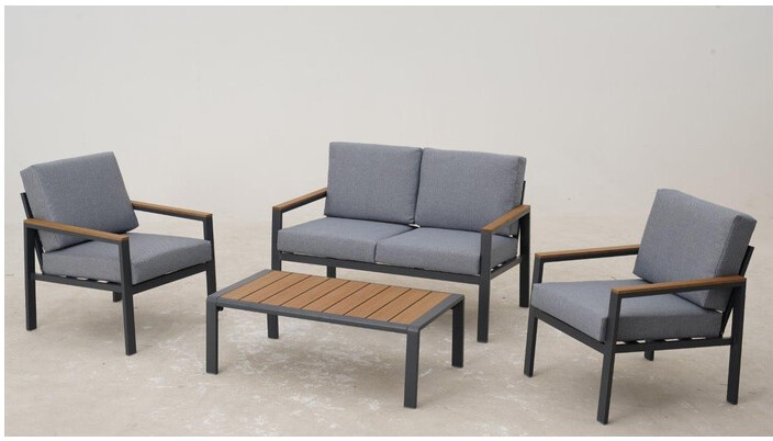 Set Sofa composto da 2 poltroncine, 1 divanetto 2 posti e tavolino da caffè. Strutture in alluminio verniciato a polvere epossidica di colore antracite, braccioli con inserto in “Polywood” di colore Teak , cuscineria in poliestere di colore grigio, tavolino con piano a doghe di “Polywood” di colore Teak.