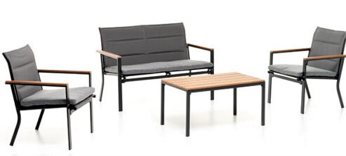 Set Sofa composto da 2 poltroncine, 1 divanetto 2 posti e tavolino da caffè. Strutture verniciate a polvere epossidica di colore antracite, braccioli con inserto in “Polywood” di colore Teak , cuscineria in poliestere di colore grigio, tavolino con piano a doghe di “Polywood” di colore Teak.