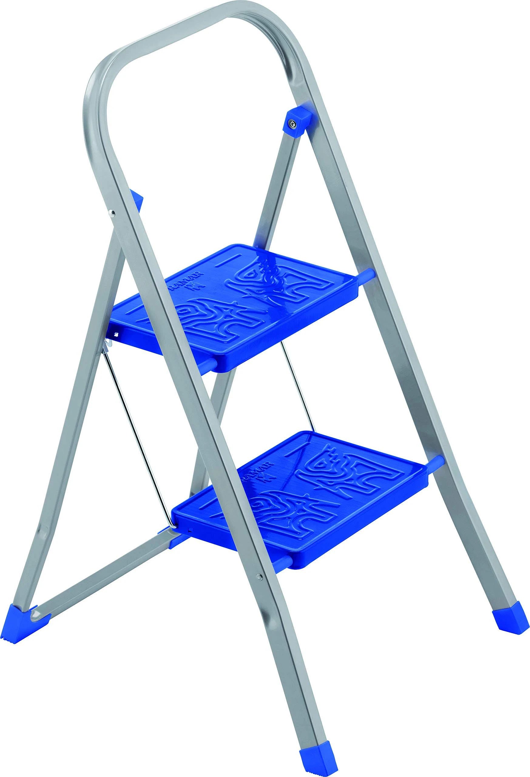 Minimo ingombro da chiuso.Struttura in acciaio verniciato, gradini antisdrucciolo, piedini antiscivolo, bloccaggio di sicurezza.